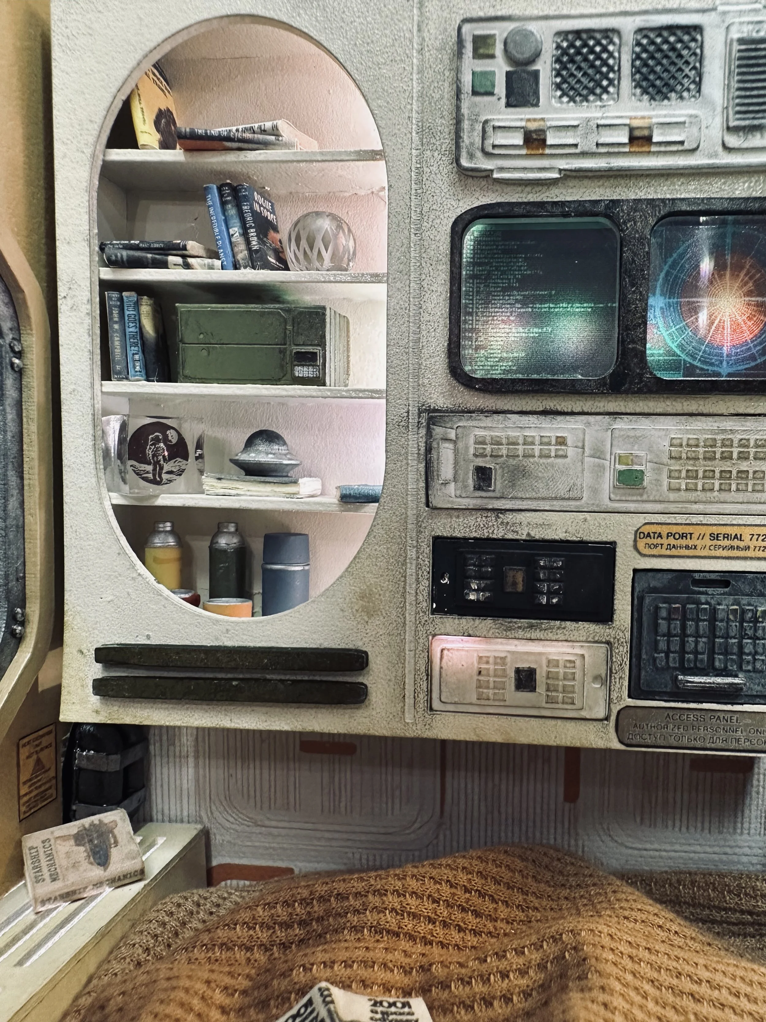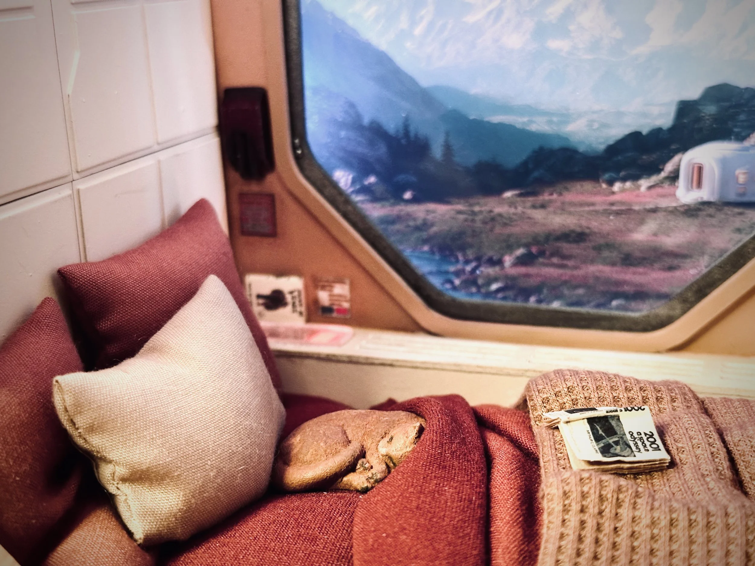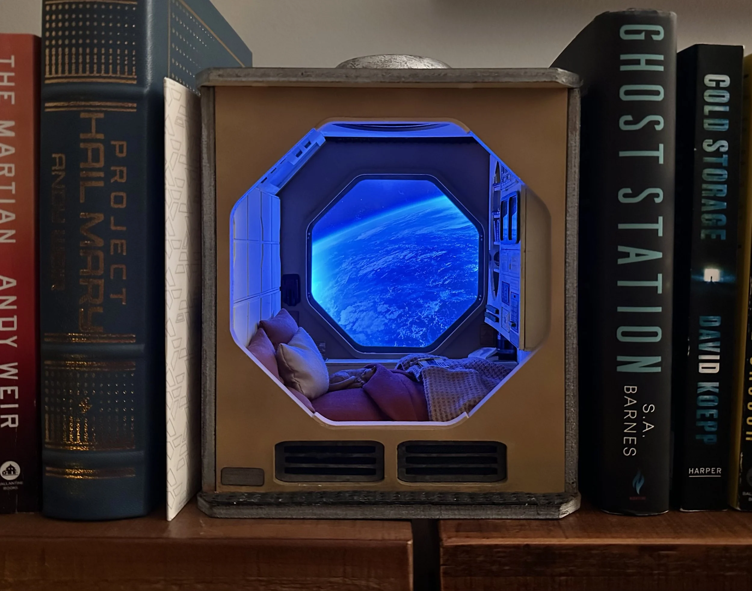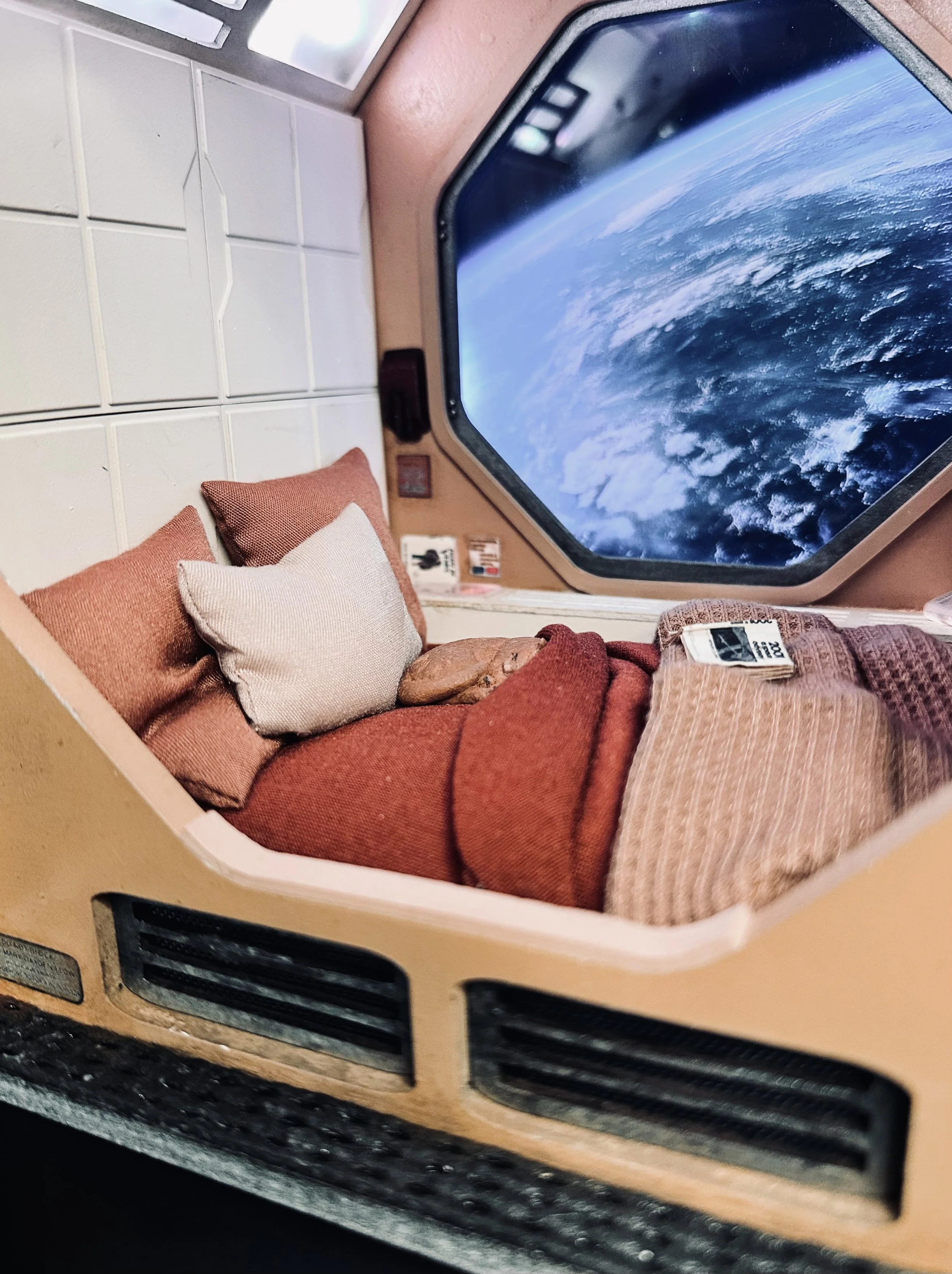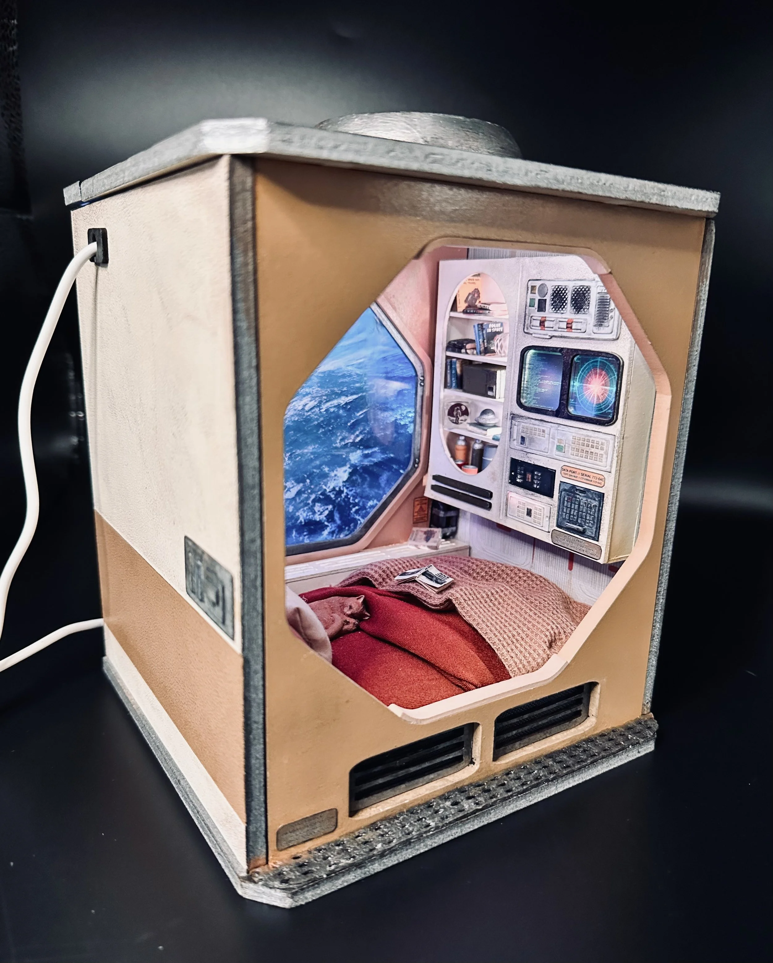 The Space Pod is an original 1:15 scale diorama inspired by classic science fiction, retro-futuristic design, and a couple of cozy space pod images. Combining a custom designed laser-cut MDF structure, multiple lighting rigs, and hand-painted details, this build explores texture, lighting, and storytelling in a confined, cinematic space. Exploring how isolation can feel both lonely and peaceful — in space, and in miniature.