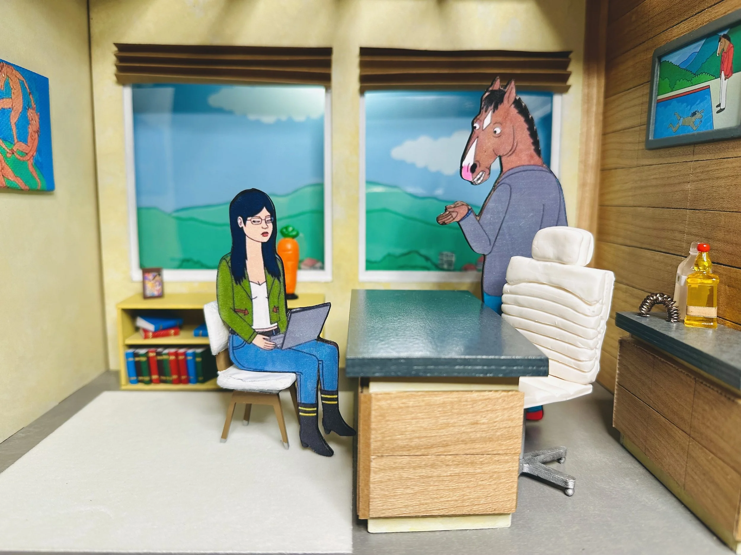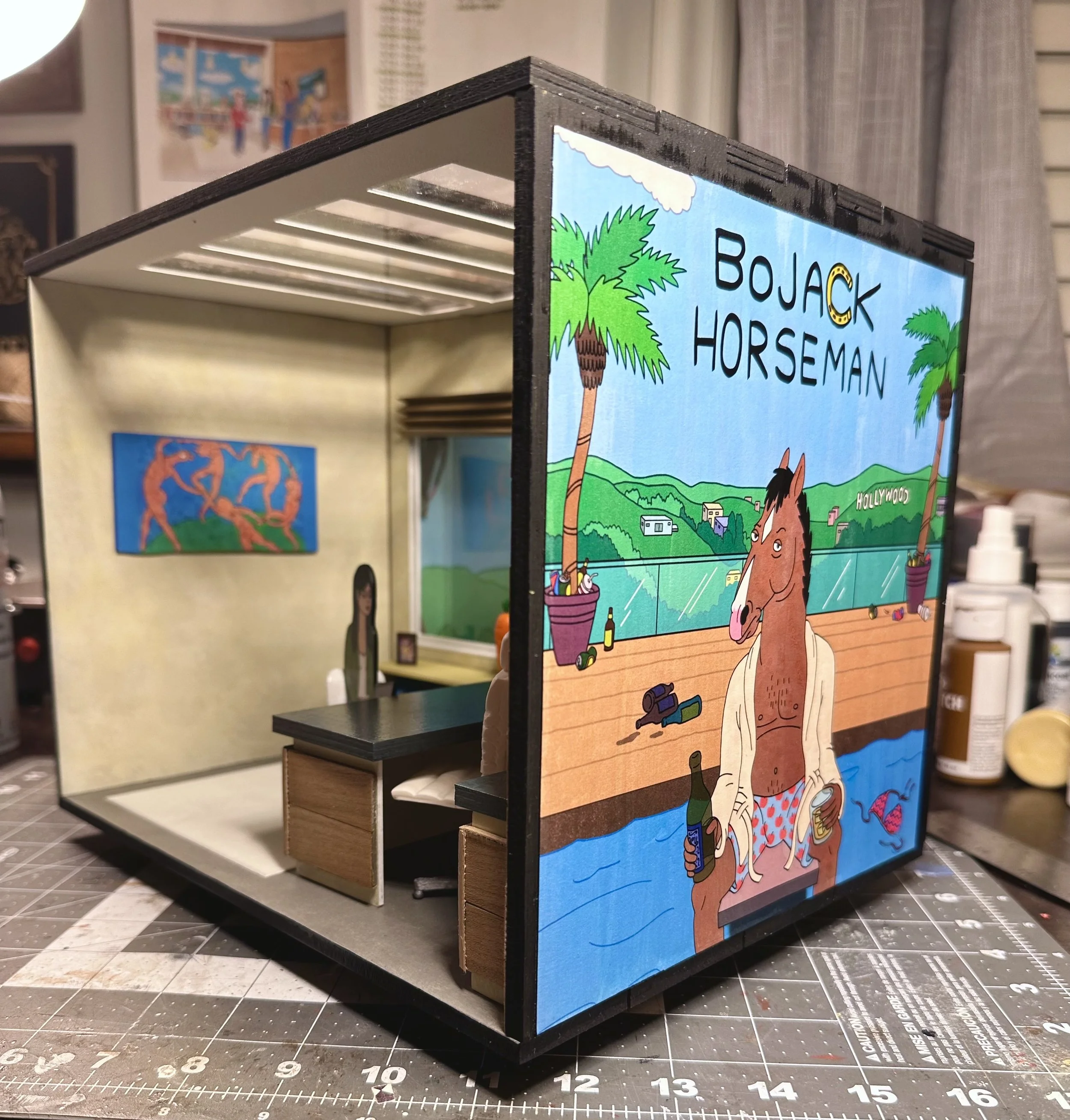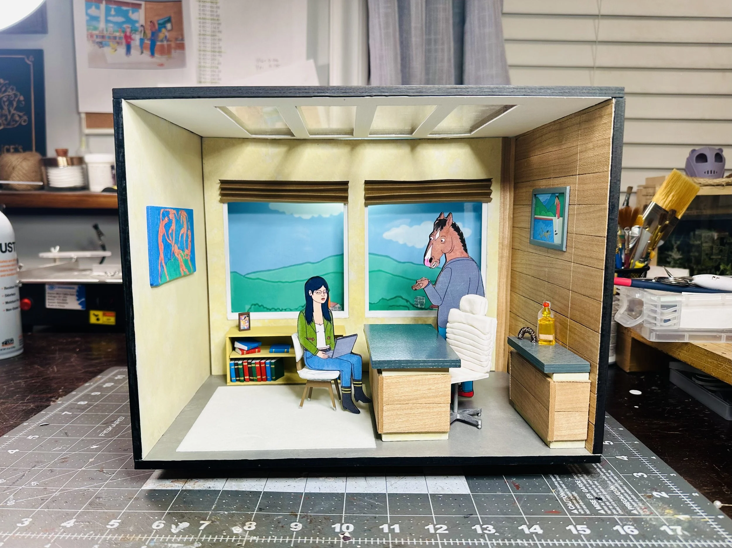 This miniature captures BoJack Horseman’s office from the acclaimed animated series — complete with character cutouts of BoJack and his Diane. Translating a 2D world into 3D form was a creative challenge I loved tackling. The result is a surreal blend of cartoon and craftsmanship that mirrors the show’s tone: witty, melancholy, and a lot of fun.