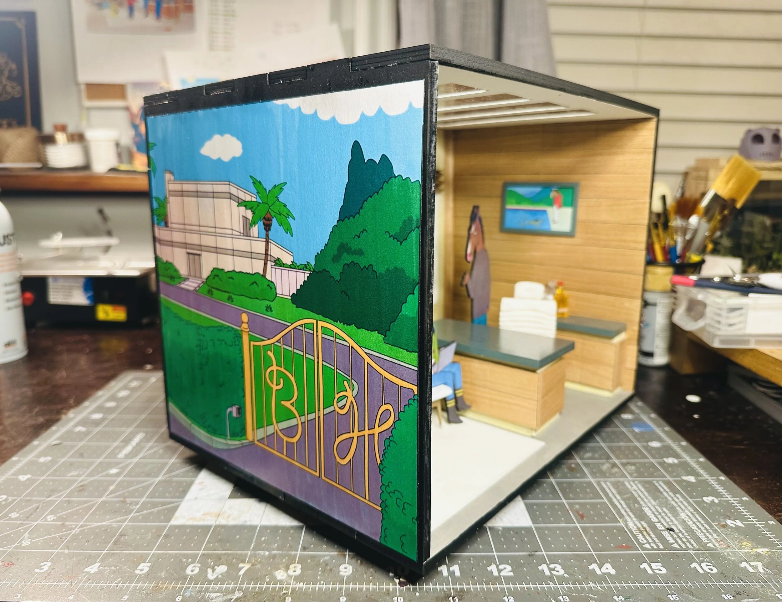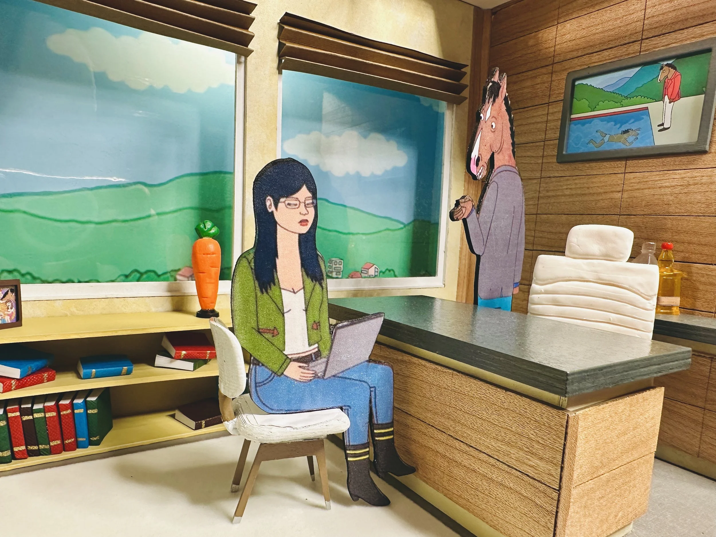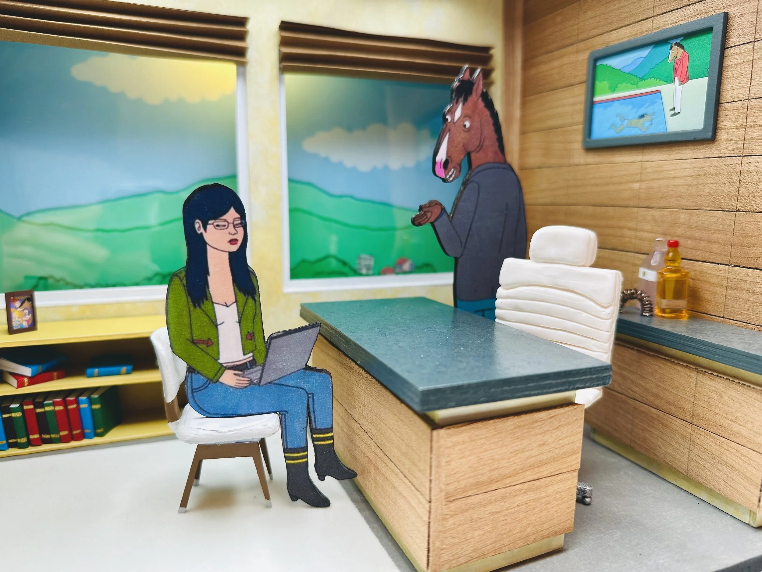 This miniature captures BoJack Horseman’s office from the acclaimed animated series — complete with character cutouts of BoJack and his Diane. Translating a 2D world into 3D form was a creative challenge I loved tackling. The result is a surreal blend of cartoon and craftsmanship that mirrors the show’s tone: witty, melancholy, and a lot of fun.
