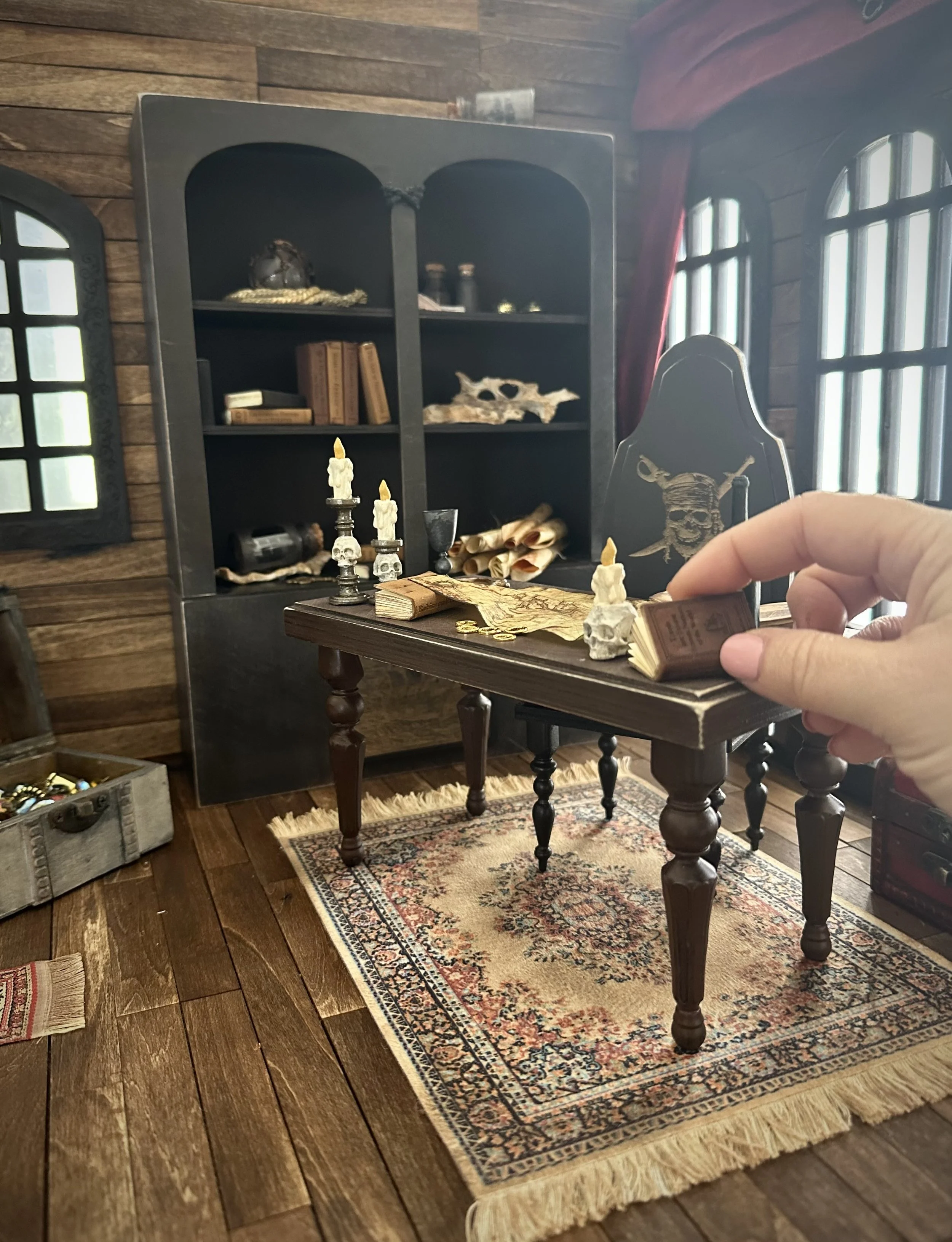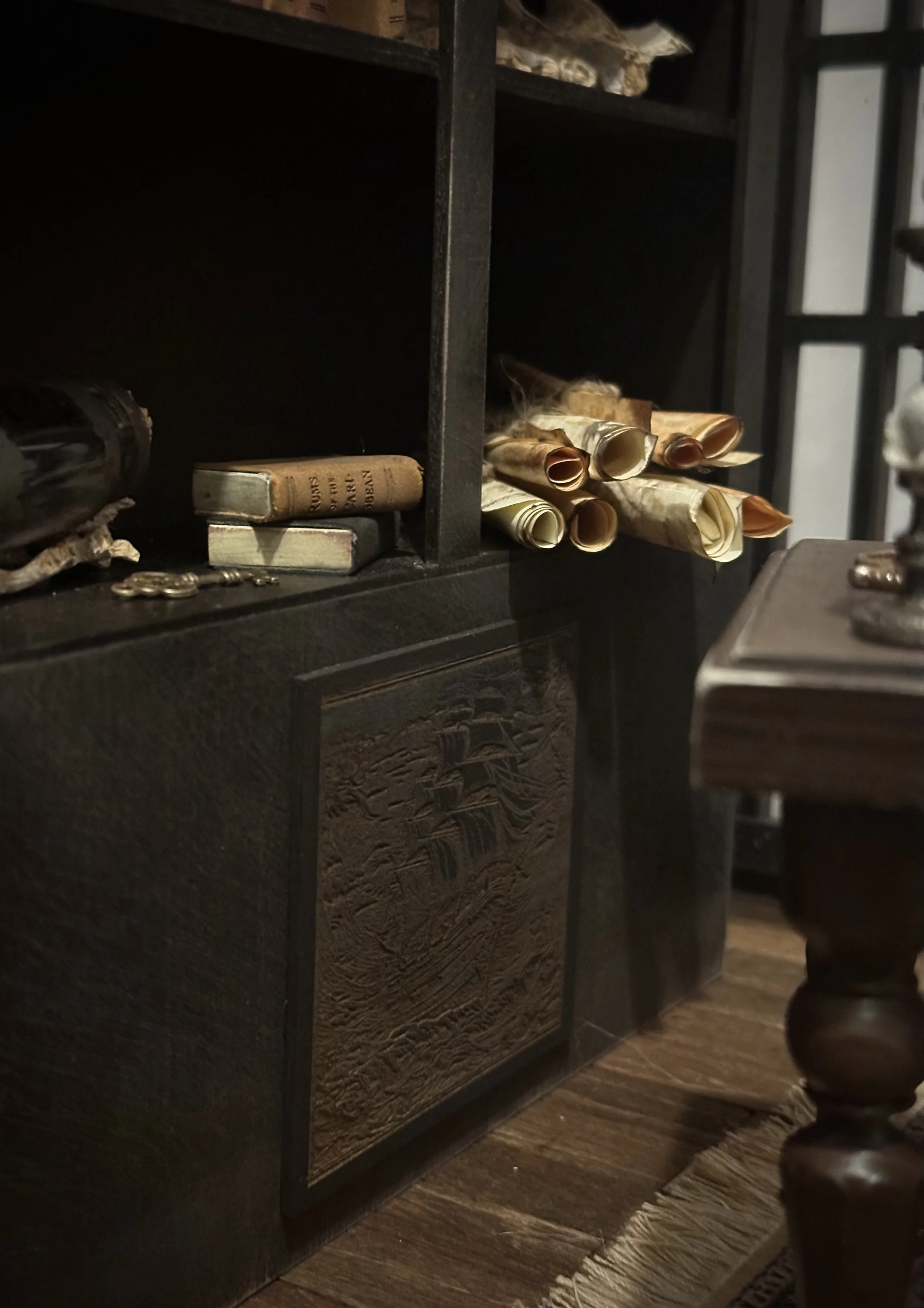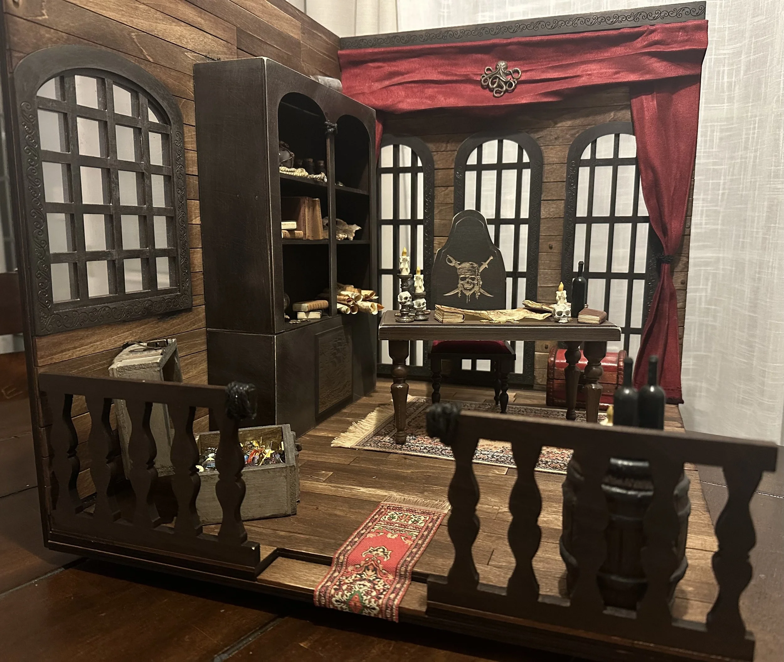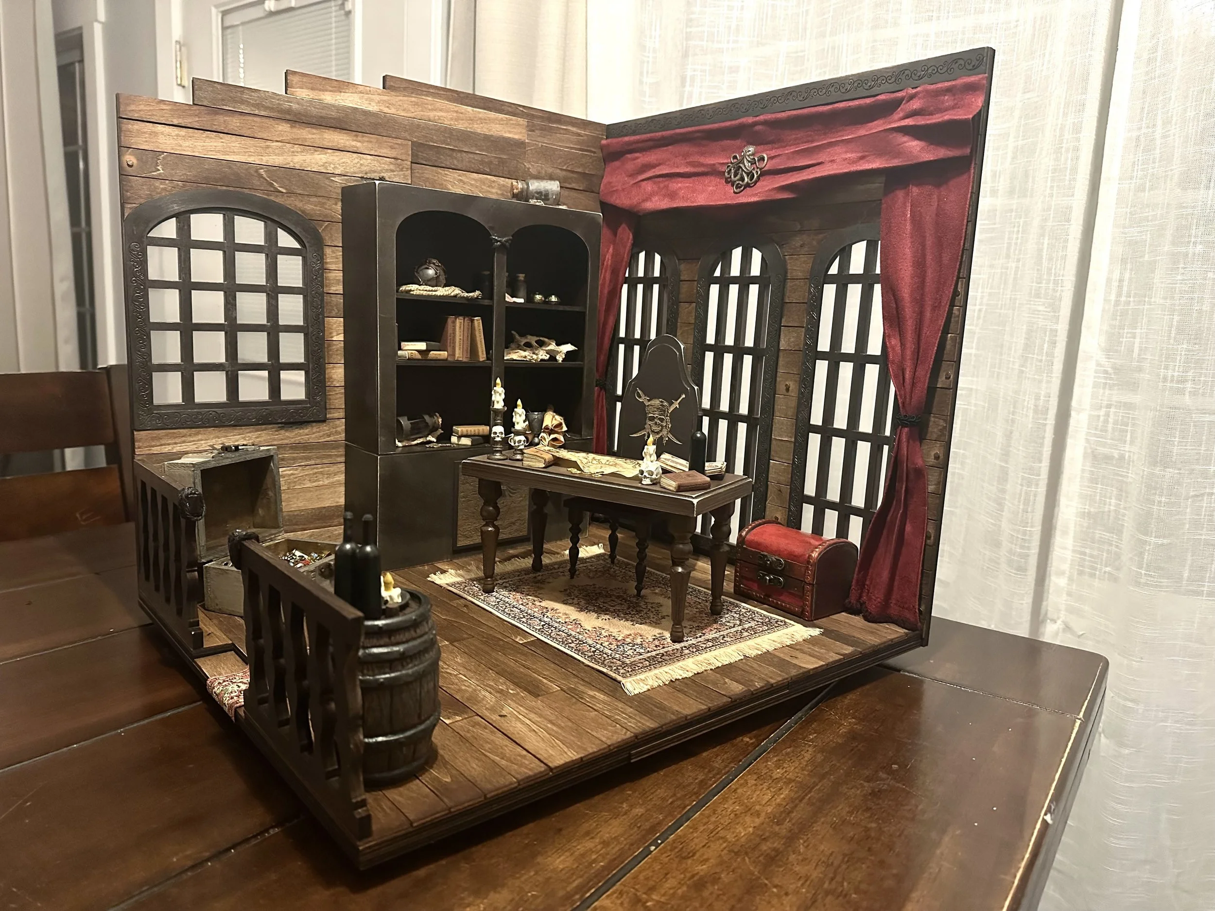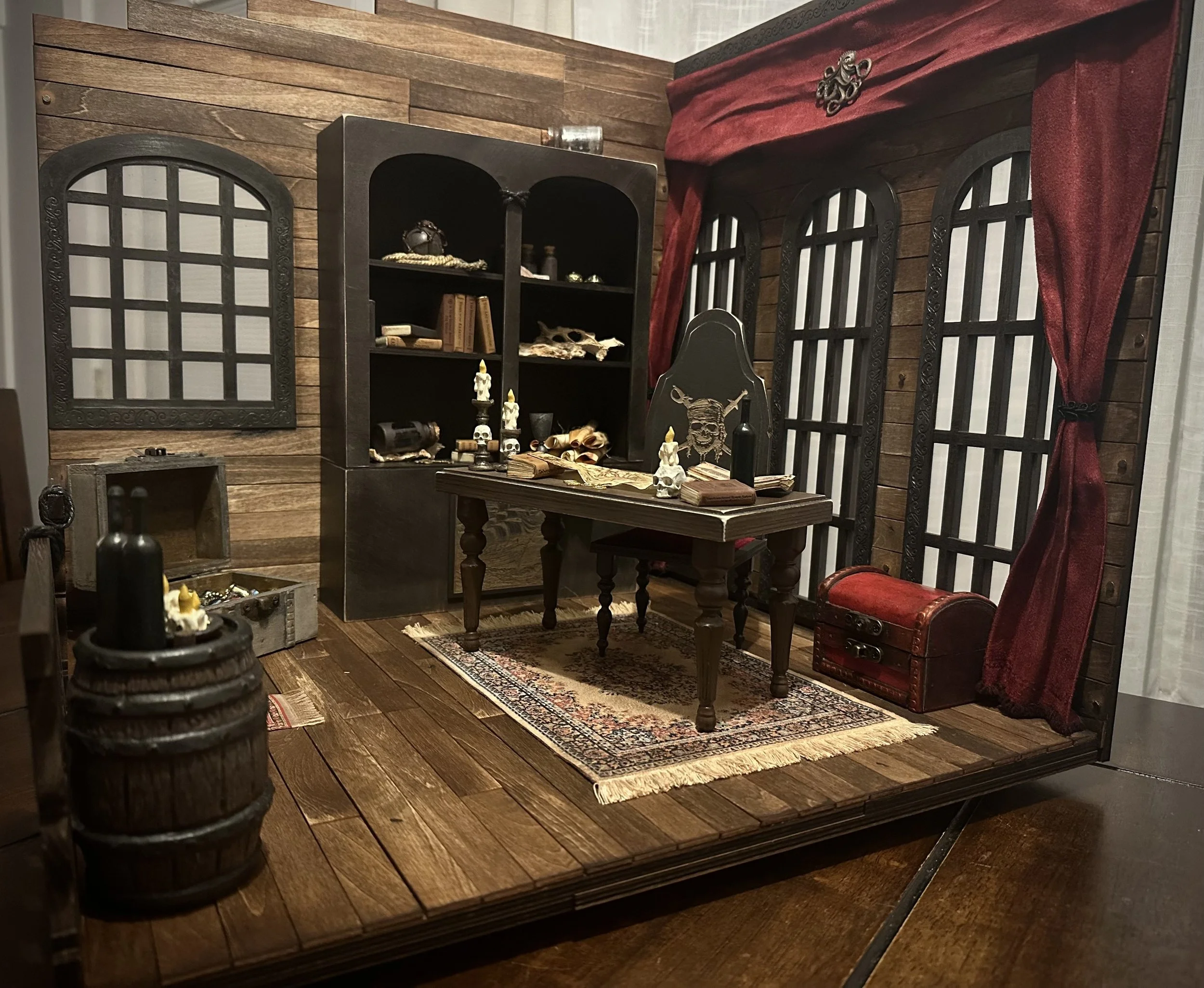 Inspired by Pirates of the Caribbean, this diorama brings the legendary Captain Jack Sparrow’s quarters to life — nearly 20 inches of hand-built woodwork with dozens of wooden planks, chart maps, and treasure. From the captain’s desk to the rum barrel and ship in a bottle, every piece was crafted to feel like it’s straight from the high seas. This is one of my most ambitious builds yet — a tribute to adventure, mischief, and the freedom of the ocean.